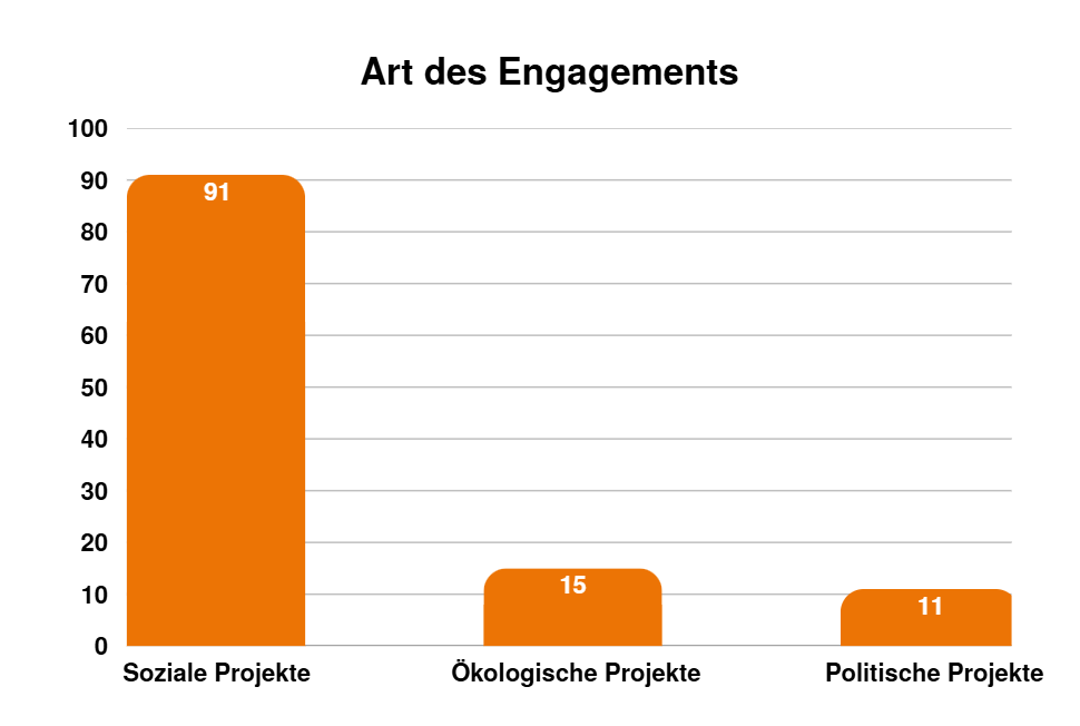 Nach wie vor widmen sich die meisten Projekte dem sozialen Bereich. Ganze 91 Projekte sind darauf ausgelegt, andere Menschen zu unterstützen.